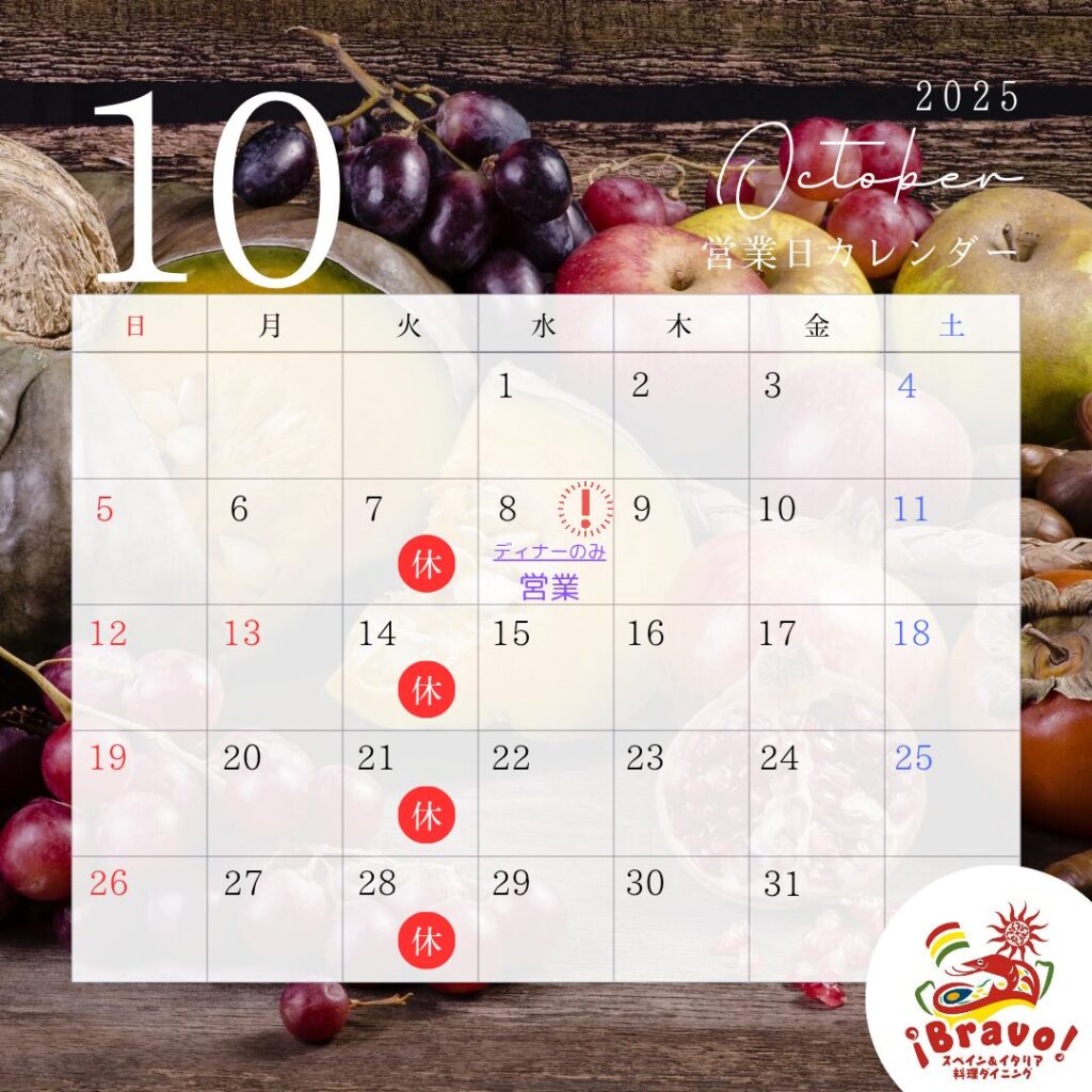 10月8日(水)は第2水曜のため、ランチはお休み・ディナーのみの営業となります。